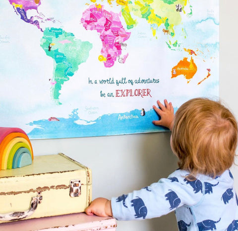 Jen from The Crafty Traveller and I met through the Indie Roller Facebook group, where she was looking for an illustrator to help her bring her vision of a brightly illustrated children’s map to reality. I submitted my work and was pleasantly stunned to be chosen. I was thrilled and also TERRIFIED as I always am when creating work for someone else. We were also both on mat leave with our first babs, so between working out the details of this piece there was a lot of chat about breastfeeding and sleeping habits!