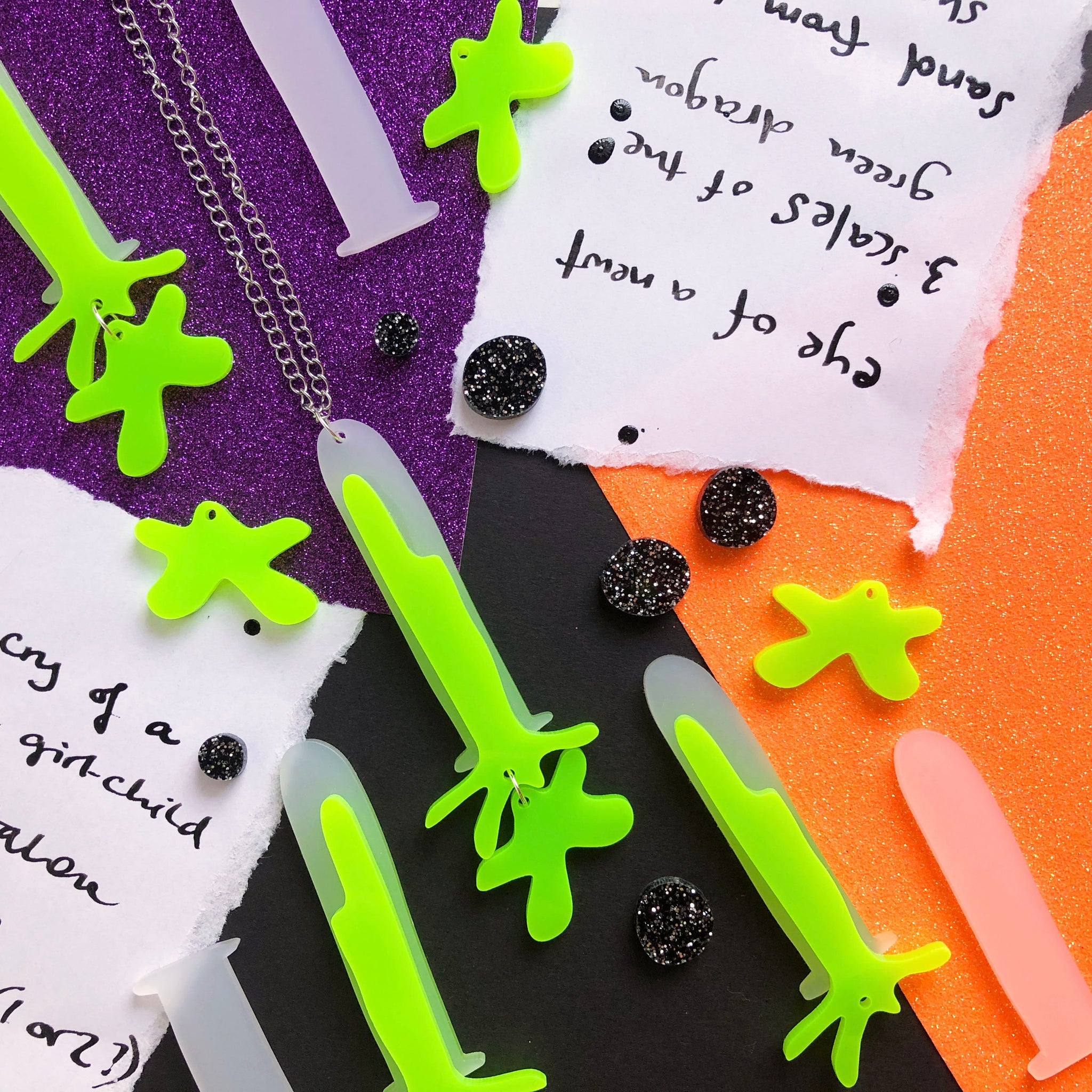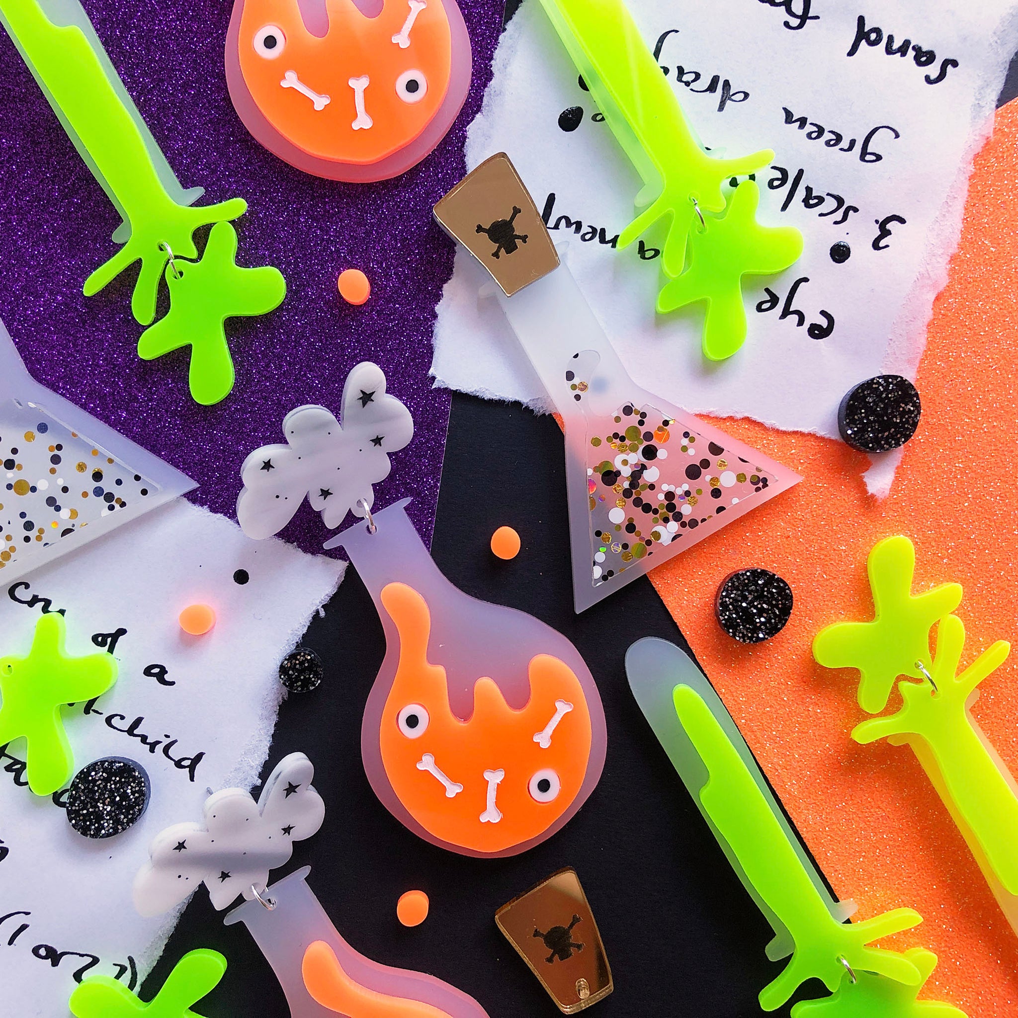Out of this collection this is the only design that didn't need a tweak once I was done sampling. From the ARGH of the neon green to the pleasing SPLAT that dangles from the bottom, I was in love with them as soon as I made them. In my head these vials contain snot, but I wondered if that might be a bit too disgusting for the less seasoned witches out there. You have Shakespeare to thank for the less gross name.
