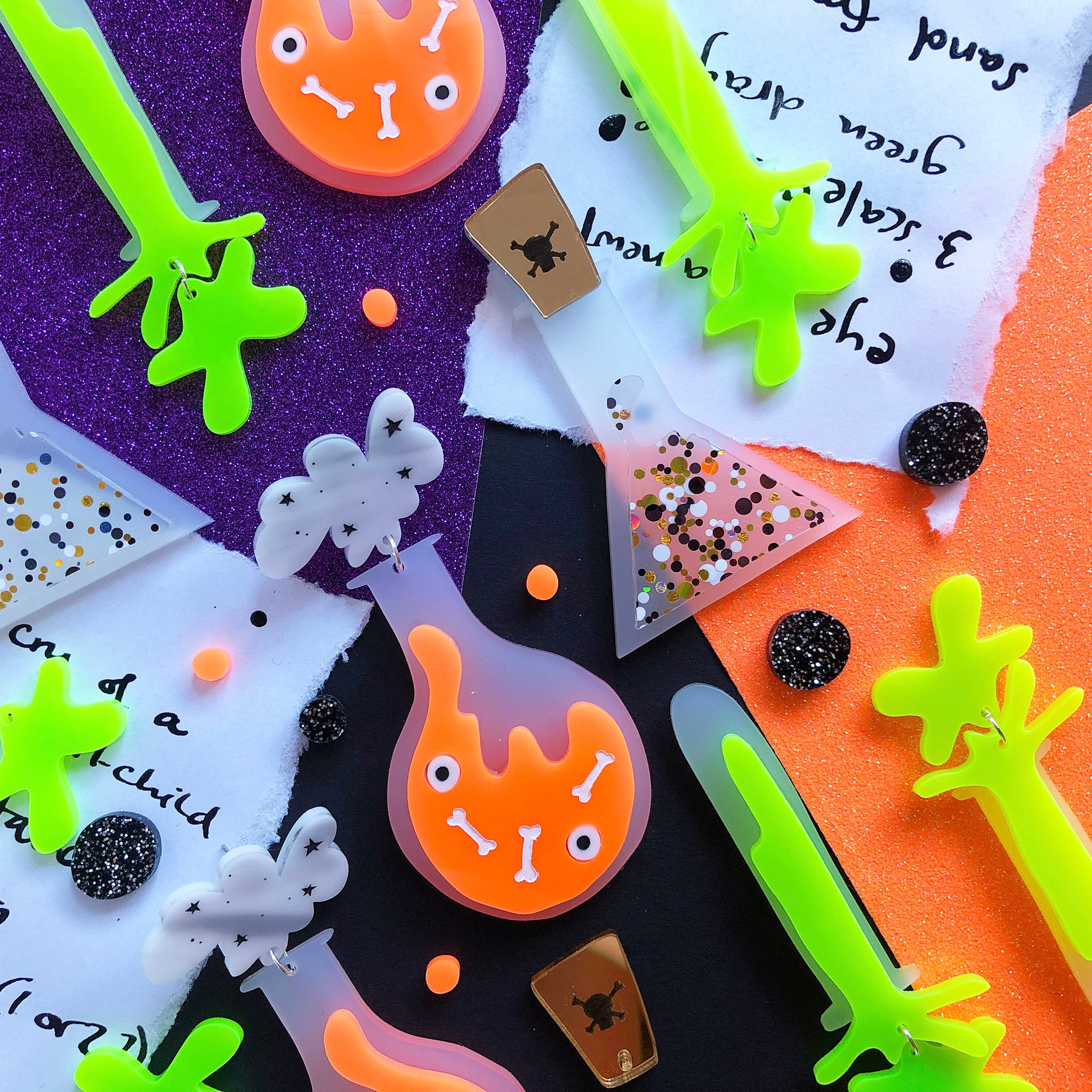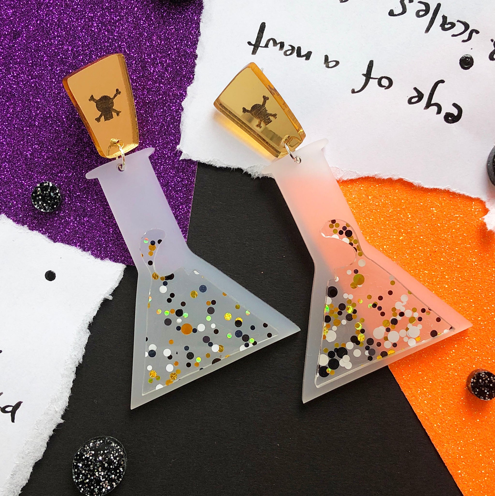 Bit of Shakespeare for you there, because these earrings turned out a lot more elegant than I was planning and I LOVE THEM. I feel like these would go perfectly with a corporate goth look, like if you worked in a vampire bank or something. The little flash of gold of the stopper with the engraved skull and crossbones (so you KNOW its going to be delicious) is echoed quite magically in the little flecks of iridescent gold confetti in the acrylic that makes the 'liquid' in the potion bottle. This design is the classy option, and she absolutely knows it.