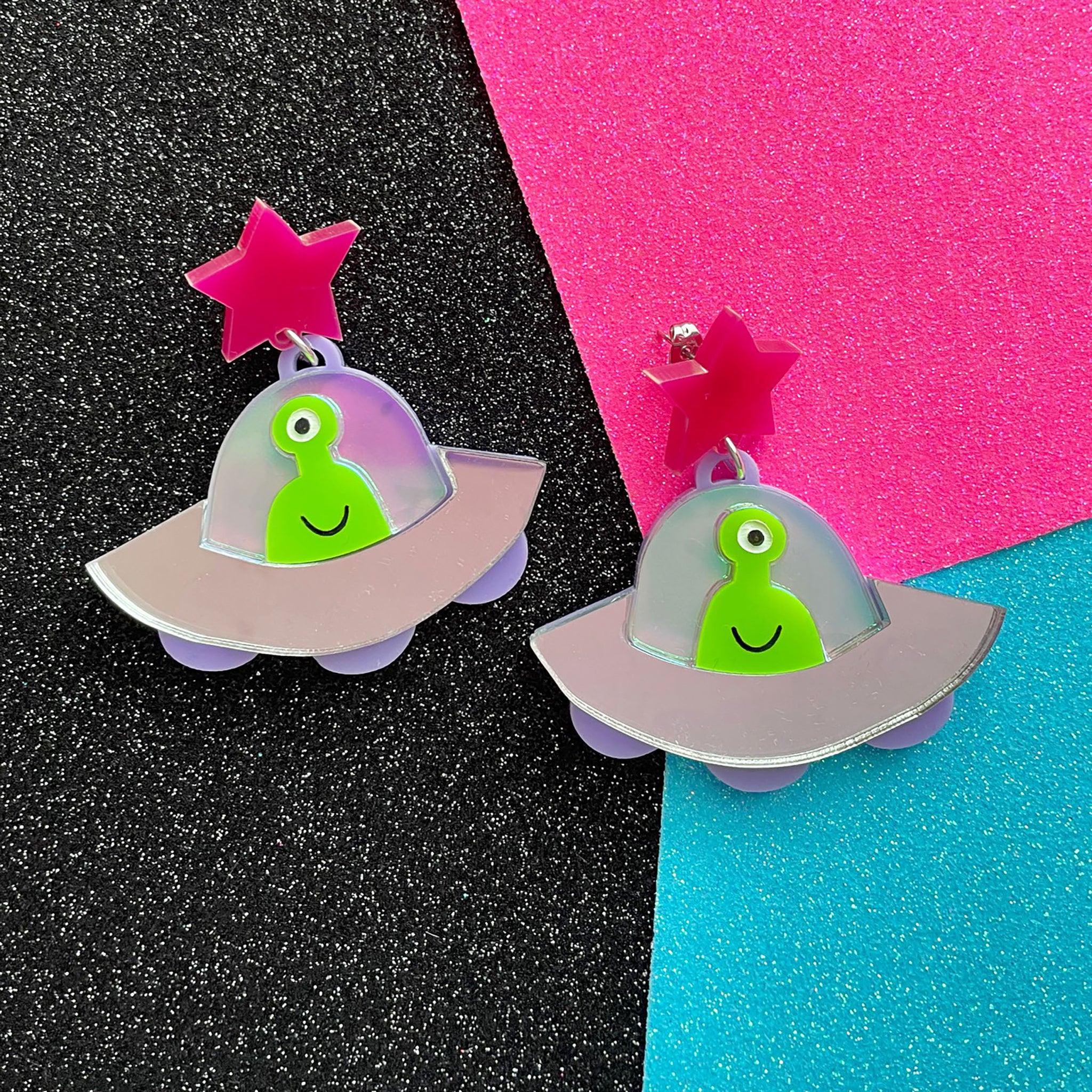 - 6mm (total thickness) laser cut acrylic flying saucer shaped earrings
