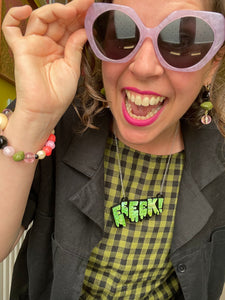Inspired by classic horror comics and movie poster lettering, this gooey, glittery, green slime is backed on 3mm black.